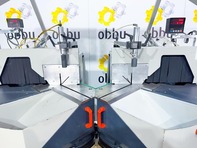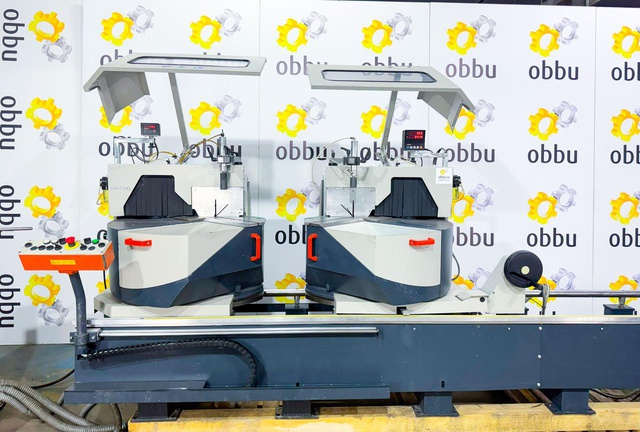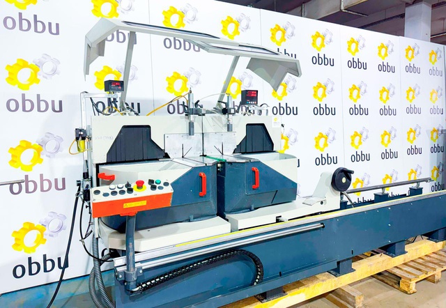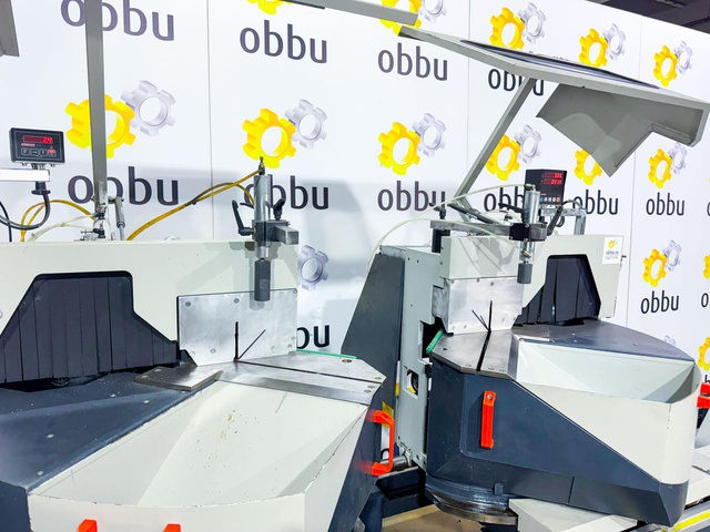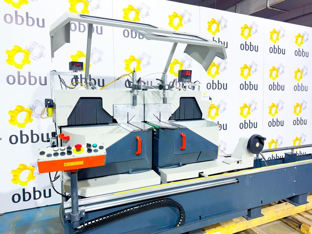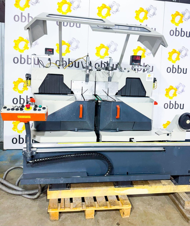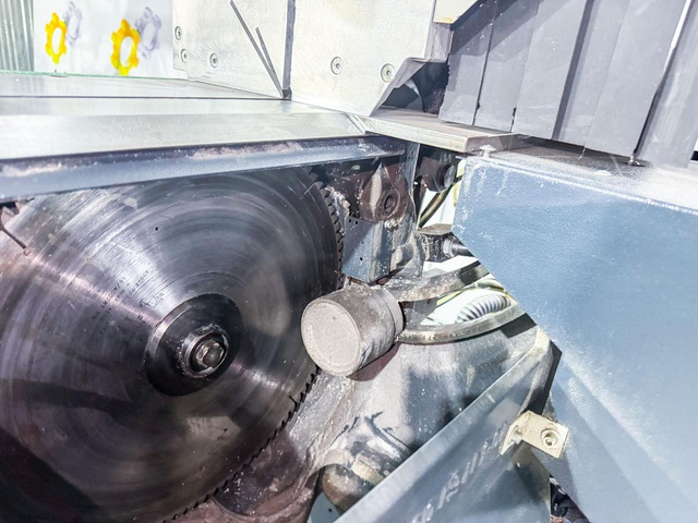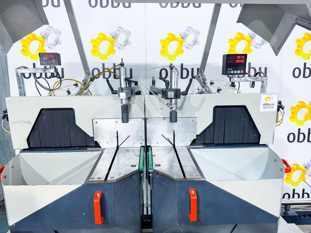 Скорость вращения пилы 2800 об / мин. Дисковая пила может разрезать заготовки минимальной длиной 335 мм и максимальной длиной 4500 мм. Станок имеет две режущие головки (два отрезных диска), которые одновременно разрезают профиль с двух сторон, что вдвое сокращает время обработки. Кроме того, двойная торцовочная пила оснащена, среди прочего, подающим устройством и отрезными дисками.