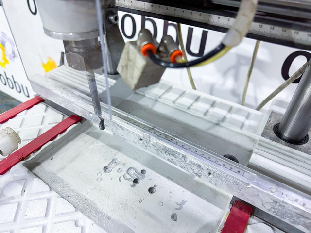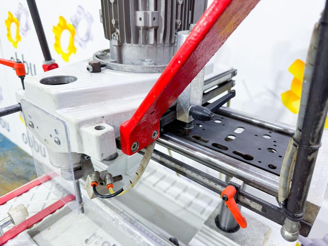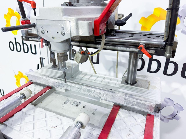 Оснащён электродвигателем мощностью 1,1 кВт, двумя горизонтальными пневмоприжимами, регулятором глубины подачи фрезы, системой пневмоподачи СОЖ.