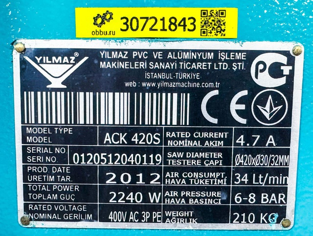 YILMAZ ACK 420 S Одноголовочная пила с нижней подачей пильного диска для резки заготовок из ПВХ и AL профиля (Б/У оборудование)