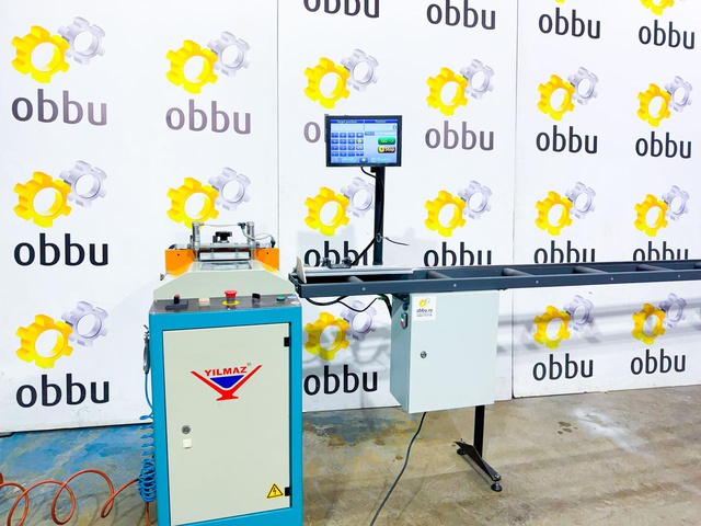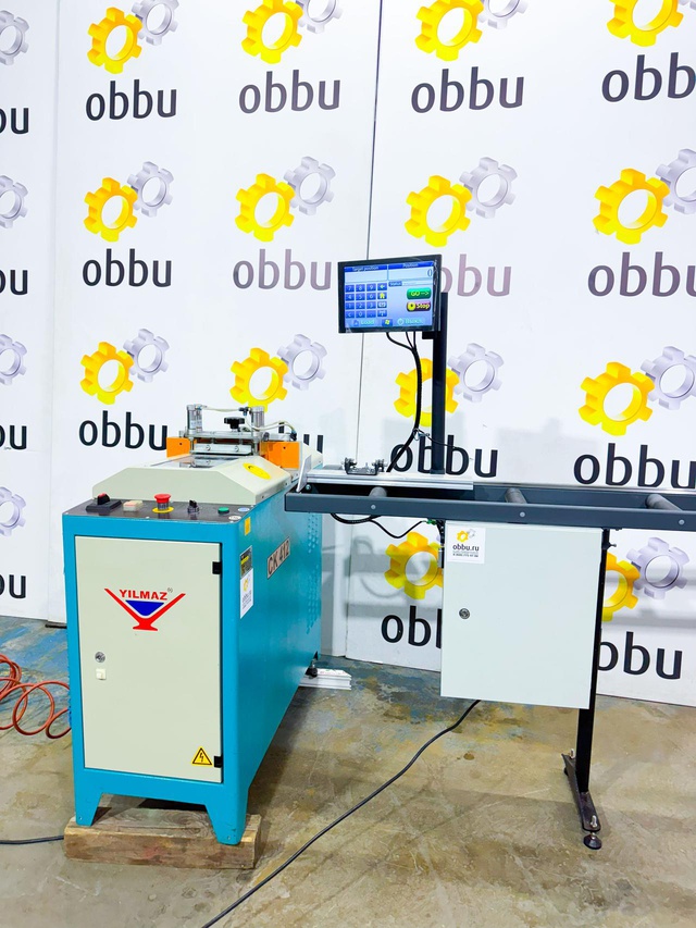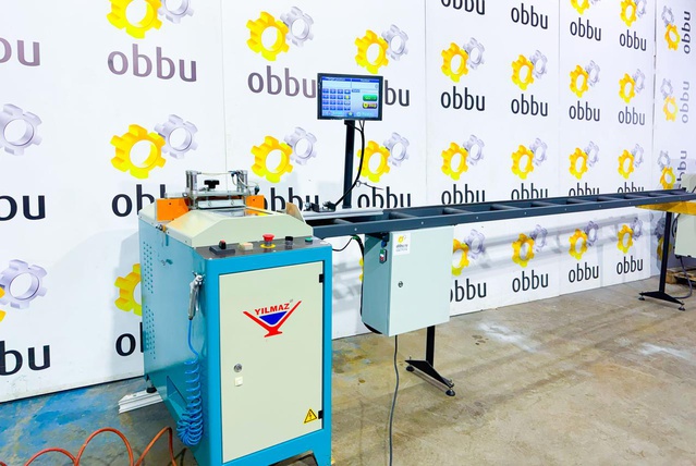 YILMAZ CK 412 Штапикорез безцулажный для автоматической резки ПВХ штапика и Электронный автоматический роликовый рольганг 4 метра с выгрузкой размеров для отрезных станков (Б/У оборудование)