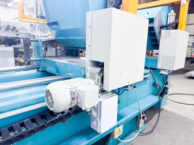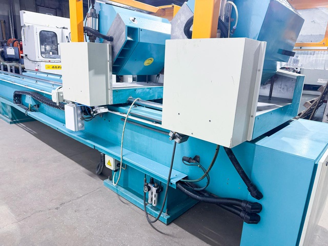 Левая голова пилы неподвижна, а правая автоматически перемещается на заданный на пульте управление размер. Углы резки изменяются в пределах от 45° до 90°, при этом под основные углы 90° и 45° пильные диски наклоняются автоматически, а резка в промежуточных углах настраивается вручную. Гидропневматическая подача пильного диска во время резки делает движение максимально плавным, скорость выхода пильных дисков можно менять.